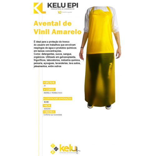 Avental de segurança confeccionado em laminado de PVC transparente, fita de PVC soldados, cordão branco ou presilha plástica 1,20 X 0,70 . É ideal para a proteção do tronco do usuário em trabalhos que envolvam respingos de água e produtos químicos em baixas concentrações, como: detergentes, sucos, sangue, orgânicos. Utilizado em galvanoplastia, frigoríficos, laboratórios, indústria química, peixaria, açougues, lavanderias, lava autos, jateamentos, entre outros.